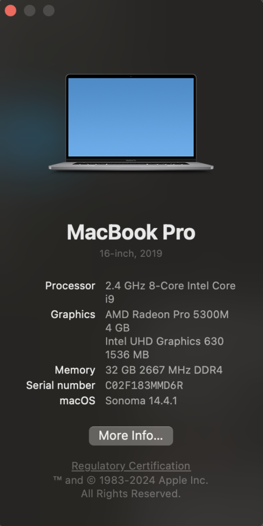 It is 2025 and Apple MacBook Pro machines have moved on to Apple M2 CPUs and it’s not easy to keep up with the hardware (cost-wise). We are using an Apple Mac Pro 16″ from 2019 running iOS Sonoma 14.4 (it’s a few years old but good enough for what is needed for these experiments)…