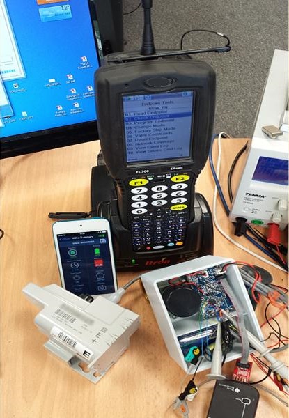 This photograph shows my desk with an early prototype and representative equipment it needed to communicate with such as an iPod running the Controller App, the Sensus module an hand-held authorization terminal and the TI Debugger tool with probes connected to an oscilloscope for testing and debugging, forming a realistic validation scenario with actual equipment that the solution is intended to be used with.