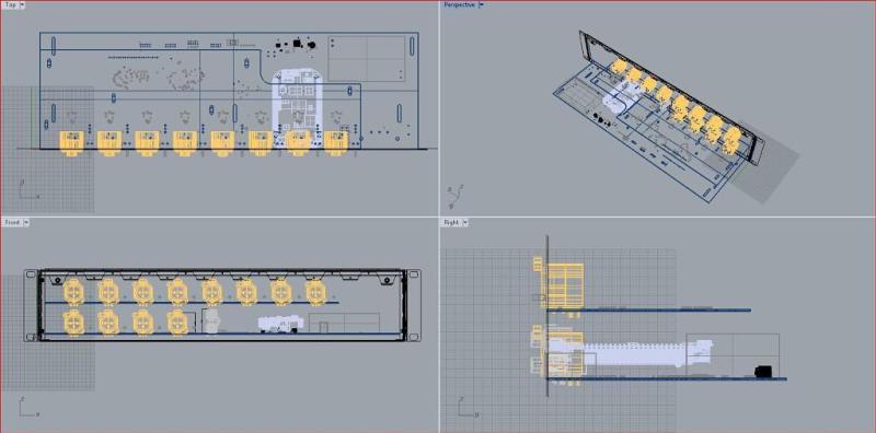 These drawings represent CAD work and mechanical engineering efforts to align and bring together two large PCBs into a 2U rack-mountable 19inch enclosure, sandwiching the electronics, with numerous industry standard connectors to the front and back of the unit, including RJ45 for remote access via SSH (into Linux) through the Beaglebone SBC.