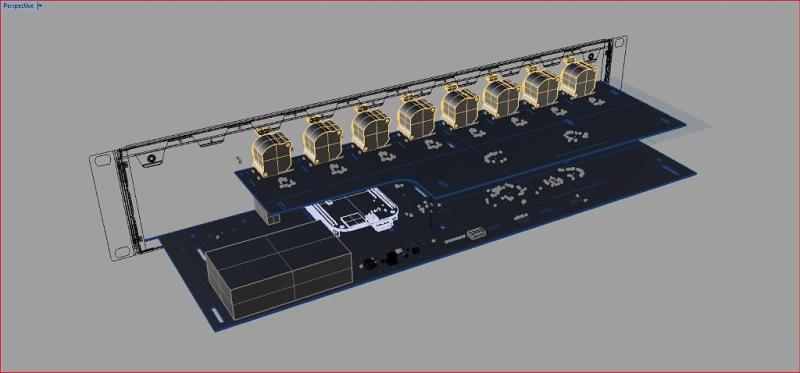 Embedded Linux audio DSP application housed in a 2U case. Images below show Altium STEP file integrated with enclosure drawings to ascertain cut-out positions for connectors. The electronics is made up of two stacked PC boards, with the lower carrying a Beaglebone SBC, AC/DC converter and dc/dc converters and upper PCB comprising of another bank of XLR connectors.