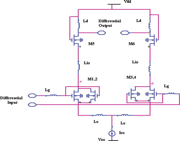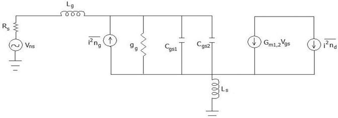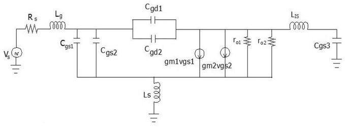 From the schematics, an equivalent model of input stage is developed for determining the simplified theoretical expressions of input impedance and output impedance of the dual CS stage and it is shown in Figure 10. The gate-source capacitances and drain-source currents are paralleled in this model. Cgs1, Cgs2, and Gm1,2 Vgs represent the gate-to-source capacitances of nMOS transistors M1, M2 and drain-source currents of both transistors. Gm1,2 is the sum of transconductances gm1 and gm2. The input impedance of the MOSFET’s without feedback is usually capacitive due to the gate-source capacitance. In order to get the resistive input impedance, an inductive feedback (Ls) is added to the source.