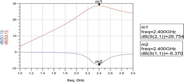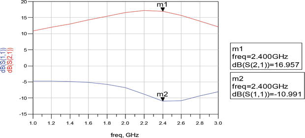 The graphs of S11 and S21 are provided in dB scale for both LNAs. SDC and DDC LNA graph of S parameter analysis with respect to RF frequency lies between the ranges of 1.0–3.0 GHz which are shown in Figures 14 and 15. The value of the input impedance matching of SDC LNA can be obtained from Figure 14. The results are indicated by markers m1 and m2. Simulation result gives the input matching value as −10.99 dB which satisfies the requirement of matching constraint of LNA that is S11 < −10 dB at 2.4 GHz. The value of forward gain S21 is reached as 16.957 dB. Normally, the requirement of gain at 2.4 GHz is in the range of 15–30 dB. LNA satisfies the gain constraint but still the value is less. Moreover, it needs balun circuit additionally to process its output to the mixer as in the case of front-end design analysis. The graphs of S12, S22 are not mentioned to avoid overlapping but traced during simulation.