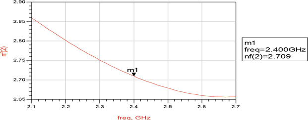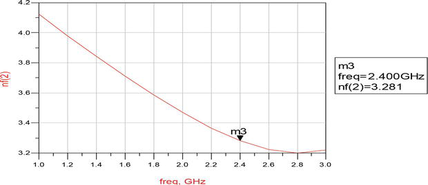 Noise figure is defined as the ratio of the total input noise to the total output noise due to the source. In general, the noise figure of LNA should remain below 5 dB to prevent inducing noise problems in other stages of the receiver, like mixer, IF amplifier, etc. The NF graphs of the proposed LNA designs are given in Figures 16 and 17. The values of NF for SDC and DDC LNA are 3.281 and 2.7 dB, respectively. These values are highly desirable in wireless receiver. Typically, an NF of less than 4 dB is required in most standard CMOS LNAs. Both designs produce better NF and satisfy the noise reduction constraint. By making use of a single-stage structure, both SDC and DDC LNA designs satisfied the objectives of LNA. Simulation results show that DDC LNA structure presented here achieve better performances in what concerns S21, NF, and impedance matching at 2.4-GHz frequency. This analysis has also proved that DDC LNA achieved comparably good performance than other LNAs. This performance study helped us to select proper LNA architecture for front-end design.
