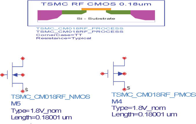 Technology scaling is the primary factor in achieving high-performance circuit designs and systems. Each reduction in CMOS technology scaling has a reduced gate delay, doubled the device density, and a reduced energy per transition. To achieve this, each transistor width, length, and oxide dimensions are also scaled by 30%. Taiwan Semiconductor Manufacturing Company (TSMC) is the world’s largest dedicated semiconductor foundry, providing the industry’s leading process technology. TSMC 0.18 micron CMOS logic process is widely used for various electronic systems such as microprocessors, microcontrollers, and high-speed processors. It provides the device models under the operating voltage of 1.8 V. Therefore, this technology scale is utilized for realizing front-end designs. TSMC 0.18-μm RF CMOS models used in this research work are shown in Figure 2. The simplified device specifications are given in Table 1. The benefits and drawbacks of silicon technologies are highlighted in this section. The availability of accurate simulation models, high-frequency models, and noise models of devices are essential for accurately predicting the performance of RF circuits.