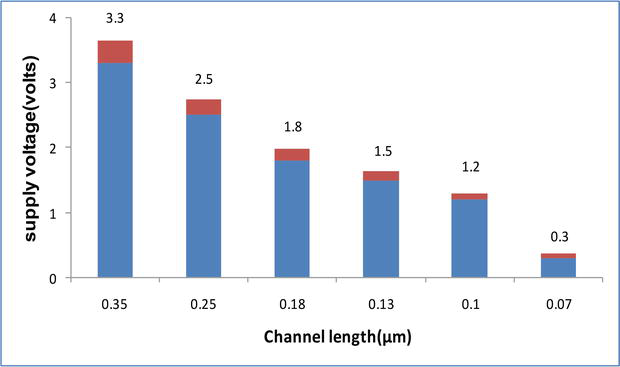 Figure 5 represents the channel length and supply voltage variation in deep sub-micron CMOS technologies [6]. It is observed that CMOS technology leads to smaller and smaller channel lengths, and the performance of RF communication circuit design will continue to improve with the reduction of supply voltage. One common technique for reducing power in analog or digital circuits is to reduce the supply voltage. In this research, front-end designs are evaluated under the supply voltage of 1.8 V. The constraint toward the low-voltage design is the threshold voltage and drain-source saturation voltage which do not scale down at an exact rate as the supply voltage or do not scale under a low-supply voltage. It is a problem as well as a challenge to face for analog designer due to the limited voltage headroom. Some circuit designs can only operate under a higher supply voltage with desirable properties and lose their high performance in a low-voltage environment. Therefore, alternative circuit structures or even system topologies need to be investigated. In modern CMOS processes, critical analog and RF circuits can be implemented with dual-gate, multi-threshold, and thick-oxide MOSFETs, which tolerate higher supply voltages, but this solution increases the cost, since additional processing masks are required [10, 11, 12, 13, 14, 15]. The development of low-voltage CMOS analog and RF front-end circuits is essential and economically advantageous.