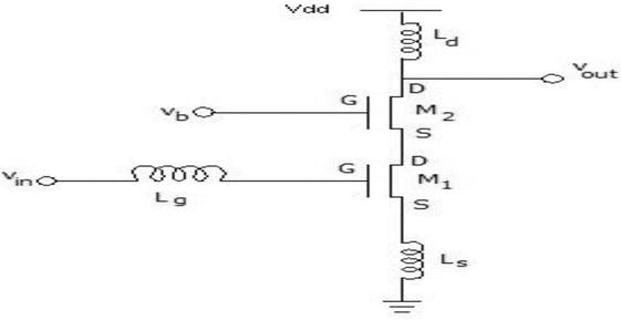 CS transistor M1 is considered as input stage driven by a signal source Vin. It is also used to drive a CG transistor M2 as output stage, with output signal Vout. Lg and Ls are the gate, source inductors of M1, respectively, responsible for impedance matching. Ld is the drain inductor of M2, responsible for output impedance matching. The importance of CS and CG stages has been highlighted by design equations and is given subsequently.
