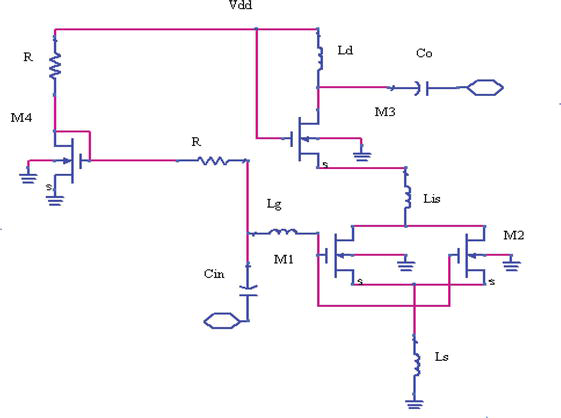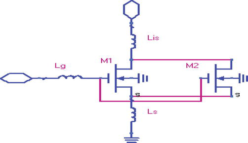 The amplification block (CS stage) of the cascode amplifier is revised in this research to achieve an optimized performance in single-ended and differential topologies using ADS software. These LNAs are titled as SDC and DDC LNA. The amplification block is altered by dual nMOS transistors at the CS stage. The purpose of this structure is to eliminate the use of an additional stage at the output for further amplification. It does not occupy much area in implementation and reduce the design complexity than two-stage LNA designs. Figure 8 represents the dual CS stage of LNA. An inter-stage inductor is added in between the CS and CG stages for improving the impedance matching. Figure 9 represents the schematic of SDC LNA architecture. It comprises input stage inductor Lg, inter-stage inductor LIS, dual CS transistors M1 – M2, single CG transistor M3, and output impedance matching inductor Ld. The bias current is chosen to provide the optimum overdrive voltage for dual CS transistors using transistor M4 and resistor R, Cin and Co are blocking capacitors used to block DC signal and allow only AC signal.