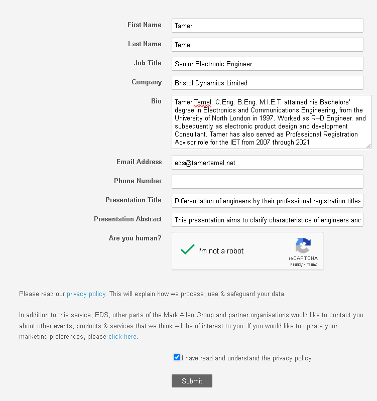 Tamer Temel. C.Eng. B.Eng. M.I.E.T. attained his Bachelors’ degree in Electronics and Communications Engineering, from the University of North London in 1997. Worked as R+D Engineer. and subsequently as electronic product design and development Consultant. Tamer has also served as Professional Registration Advisor role for the IET from 2007 through 2021.