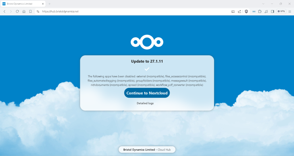 As you may be aware, NextCloud may be placed in a state of operation called Maintenance Mode. In our case we ignored this and went ahead with the update from the Admin panel (not CLI) for simplicity.