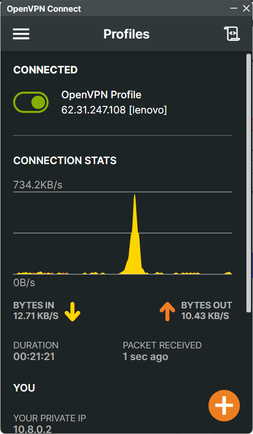 After importing the client.OVPN file, we can see the app running with VPN enabled and our ‘exposed/ IP address is not the one on out local machine but the VPN Server IP address…