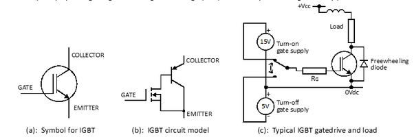The insulated gate bipolar transistor (IGBT) effectively replaced the triple Darlington in power switching applications. This is a voltage controlled device, where switching is achieved by driving a gate terminal with a voltage. The main current handling stage is a bipolar transistor. The symbol for an IGBT is shown in Figure 2(a). The IGBT is modelled as MOSFET transistor driving a PNP transistor, as shown in Figure 2(b). The IGBT is turned on by taking the gate to a positive voltage (+15 V). It is turned off quickly by taking the gate to a negative voltage (-5 V).