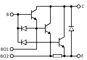 For high power transistor switches, it is common to use a triple Darlington configuration. The figure below shows the circuit diagram of a typical “Fuji” three-stage Darlington transistor used in the inverter stage of an AC Motor Speed Controller.
