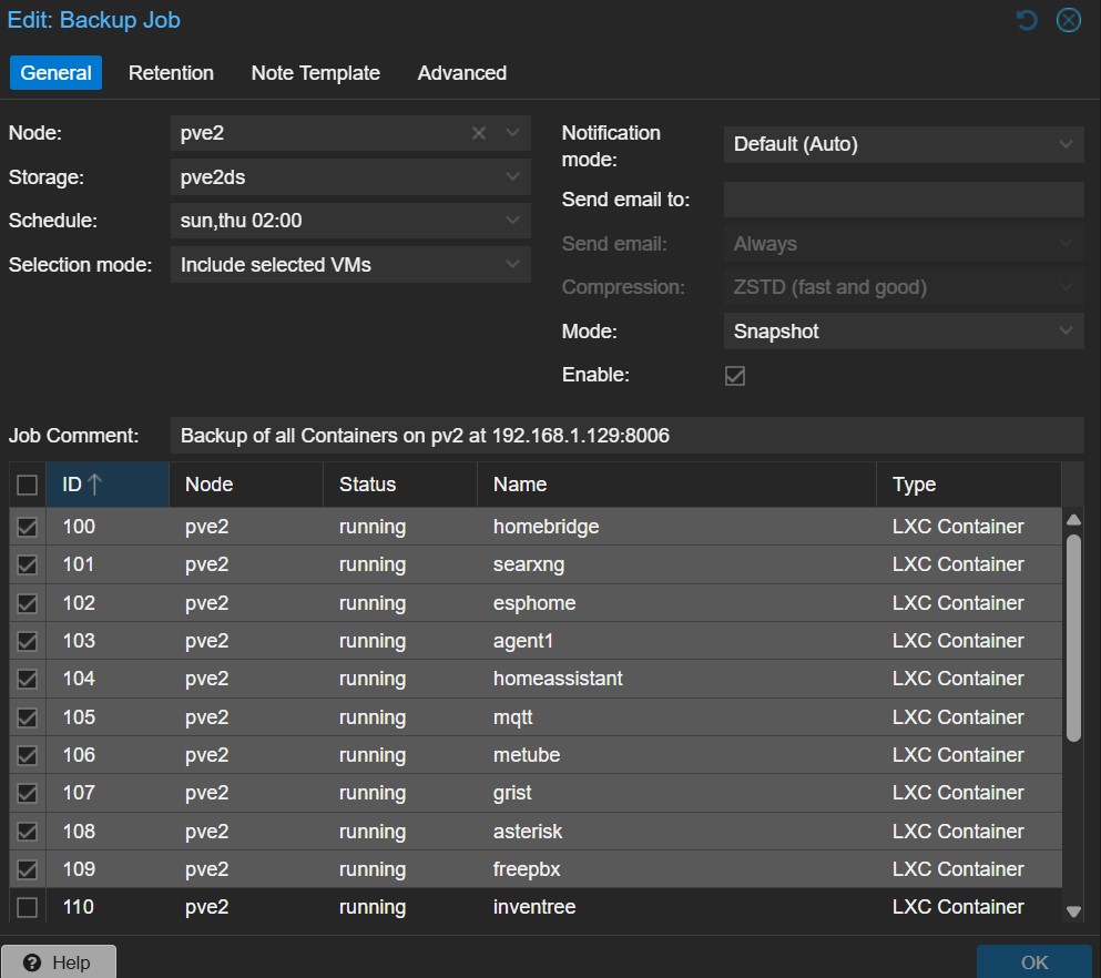 There are numerous different profiles of Backups and the image below shows that I have gone for choosing selective VM/LXC to be backed up. Only these will be backed up and in accordance with the Schedule, twice per week, on Sunday and Thursday at 2:00 am (‘sun, thu 02:00).